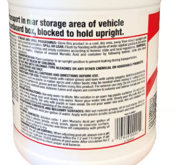 Muriatic acid Is a 20° Baume (31.45%) hydrochloric acid solution used for cleaning and preparing concrete prior to etching, coating and sealing. Muriatic acid can also be used to lower the pH in pools and spas. Unit Height: 11.31 in.
