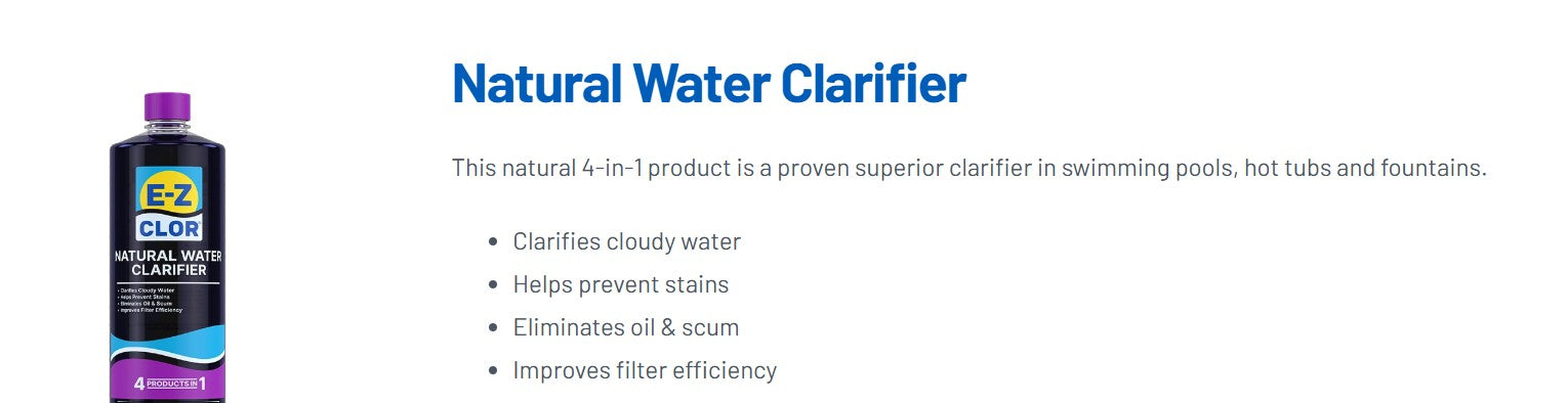 Super-concentrated fast-acting water clarifier. Clears cloudy water by collecting small particles that are unable to be filtered into larger filterable masses. No dilution required.