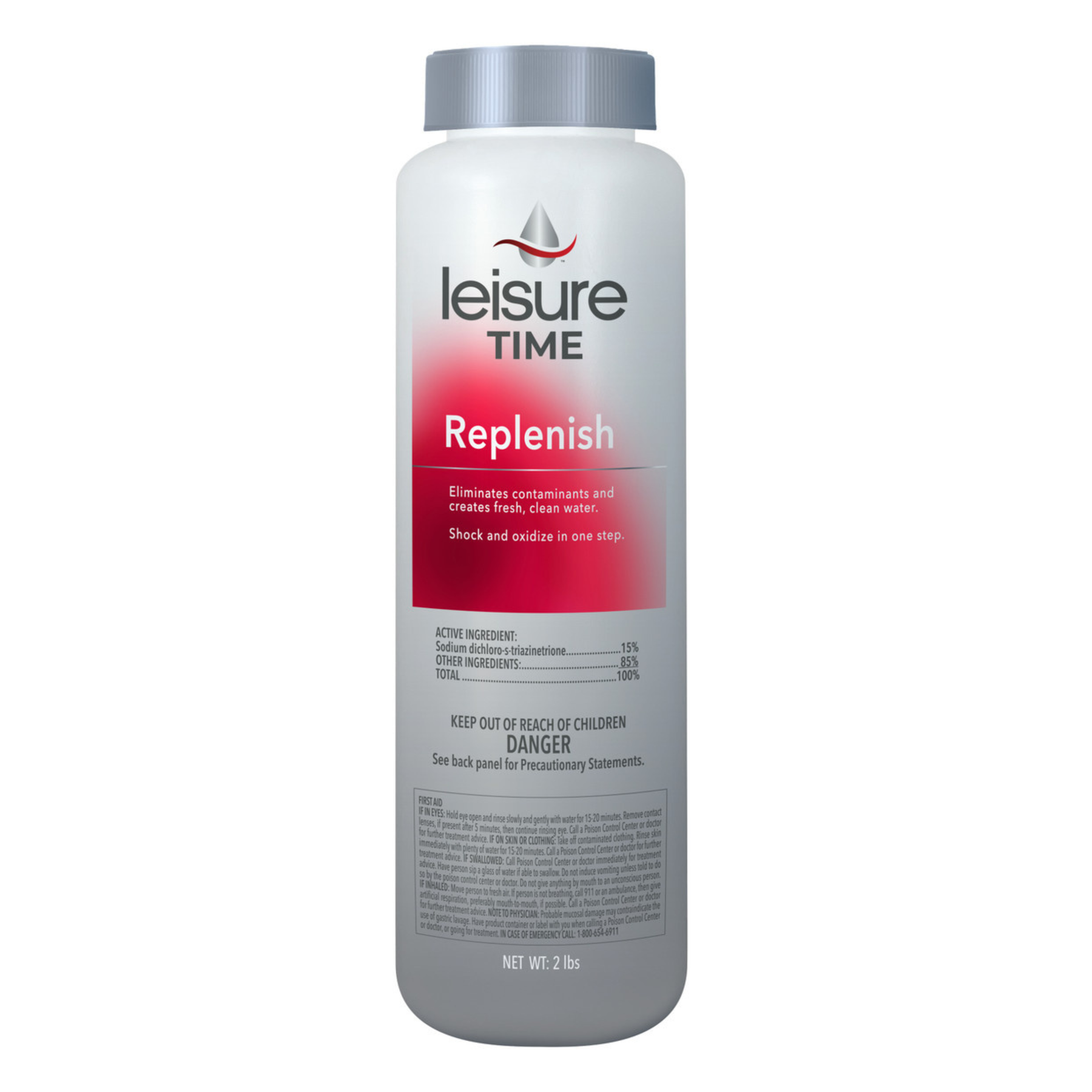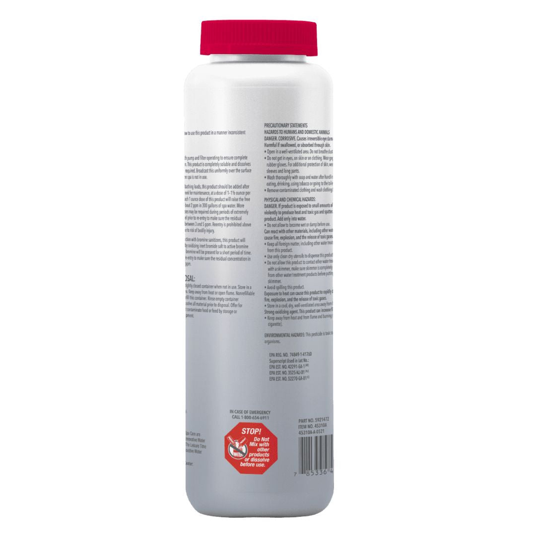 Experience swift and efficient spa water treatment with Leisure Time Replenish, a multi-functional shock and oxidizer designed for a quick, hassle-free spa care routine. With the combined power of Oxone and chlorine, Replenish acts as a shock, oxidizer, buffer, and clarifier, ensuring your spa water remains clear, clean, and soothing.