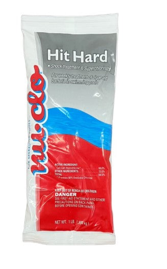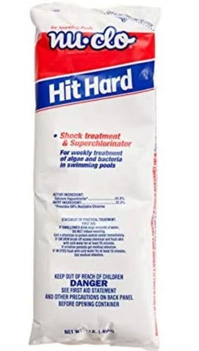 Nu-Clo Hit Hard will shock your pool water with a boost of chlorine helping to remove algae and harmful bacteria as well as help you maintain crystal clear water year round. The fast-acting 4-in-1 shock product kills bacteria and algae, restores crystal clarity to pool water within 24 hours, reduces chlorine odor and eye irritation caused by swimming pool water, and won't fade liners. It is convenient, easy to use and won't over stabilize your pool. One bag treats 13,500 gallons. TO USE: Make sure your pH level is between 7.2 and 7.8 and adjust if needed. Check that your pump is running and then snip the corner of the shock product. Broadcast over a wide area in the deepest part of your pool. If the granules settle at the bottom, use a brush to disperse them. When your free available chlorine levels are between 1 and 4 ppm, your pool is ready for action. 68% Calcium hypochlorite; 68% Available chlorine. |
