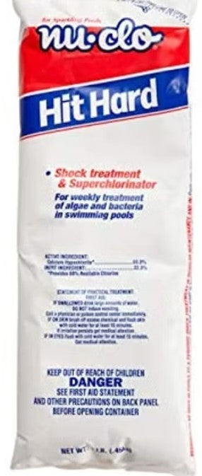 Nu-Clo Hit Hard will shock you pool water with a boost of chlorine helping to remove algae and harmful bacteria as well as help you maintain crystal clear water year round.