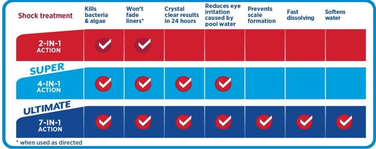 The fast-acting 4-in-1 shock product kills bacteria and algae, restores crystal clarity to pool water within 24 hours, reduces chlorine odor and eye irritation caused by swimming pool water, and won't fade liners. It is convenient, easy to use and won't over stabilize your pool. One bag treats 13,500 gallons.