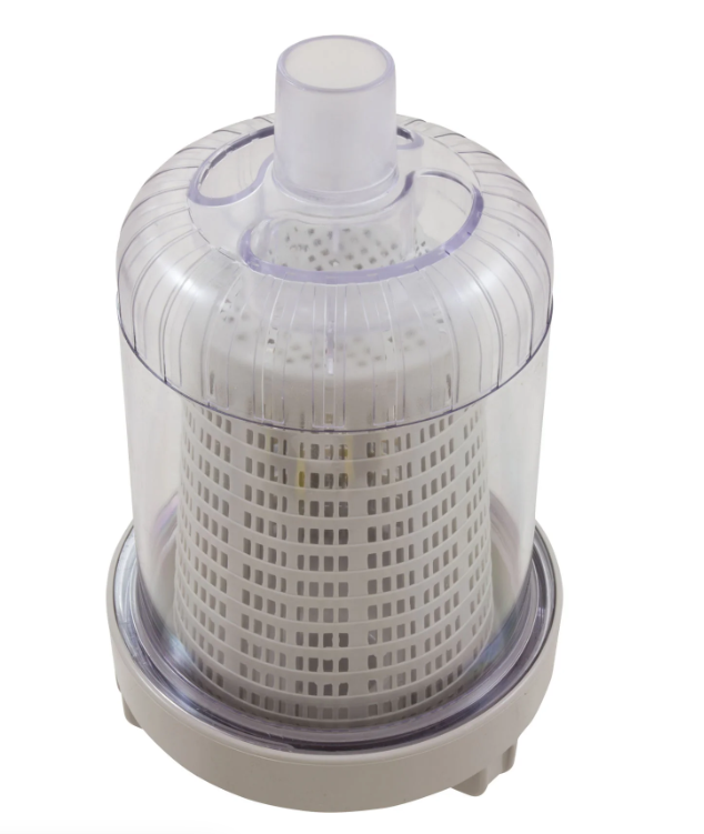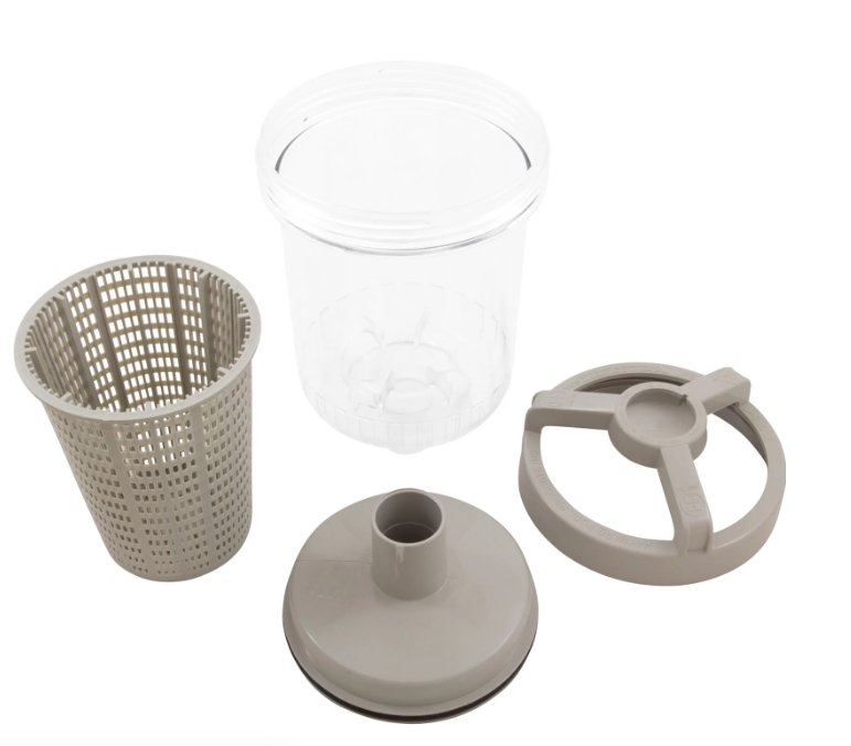 PoolStyle PS918 Tan Standard Leaf Canister with Basket for Automatic Pool Cleaner can be used with automatic suction cleaners to collect debris before it reaches the filter. Its transparent body makes it easy for capacity monitoring, and its sturdy handle allows for easy water retrieval. It also has a watertight easy-open locking system.