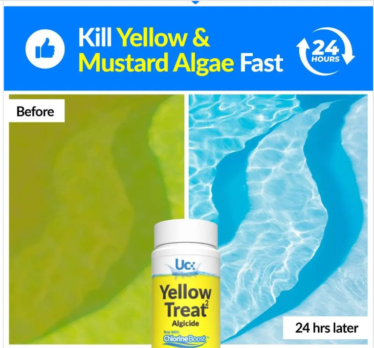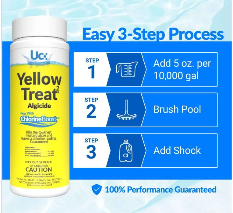 Yellow Treat®² makes killing mustard algae fast and easy. Just add 5 ounces per 10,000 gallons, brush, and shock. Then wake up the next day to an algae-free pool that still has a chlorine reading. Yellow Treat®² contains ChlorineBoost™, the patented formula of ingredients that supercharges its algae killing ability while stabilizing chlorine readings. Always add Yellow Treat®² directly to the pool or spa.